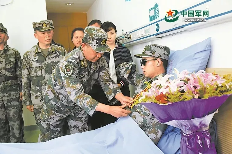 2018年11月24日,掃雷大隊(duì)為躺在病床上的杜富國(guó)頒授一等功獎(jiǎng)?wù)拢?xí)慣性地舉起右臂,向頒獎(jiǎng)?wù)咧乱詿o(wú)手的軍禮。
