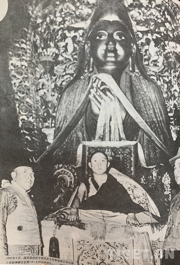 1949年8月,國民政府派專使關(guān)吉玉到青海塔爾寺為十世班禪額爾德尼o確吉堅贊(中)主持坐床典禮。(圖片翻拍自《金鑰匙o十七條協(xié)議》 陳宗烈提供)