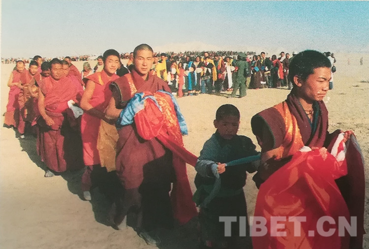 圖為哈達飄拂,駿馬奔馳。青藏線上近千名藏族騎手勒馬隨行,用最隆重的民族禮節(jié)迎接十世班禪。
