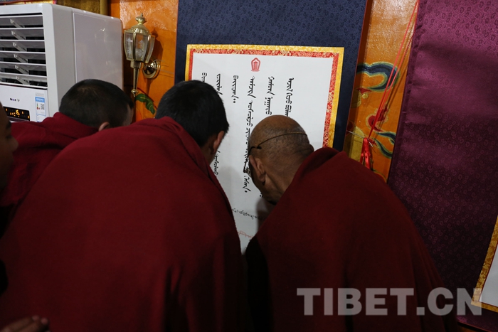 圖為扎什倫布寺的僧人們正在欣賞參賽書法作品。