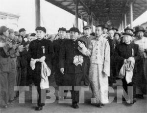 1951年4月27日,十世班禪首次進(jìn)京,周恩來(lái)總理、朱德總司令等黨和國(guó)家領(lǐng)導(dǎo)人前往北京火車車站迎接。