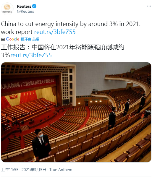 圖為兩會上的環(huán)保話題備受外媒矚目。路透社在推文中寫道,中國2021年發(fā)展主要預期目標:單位國內生產(chǎn)總值能耗降低3%左右