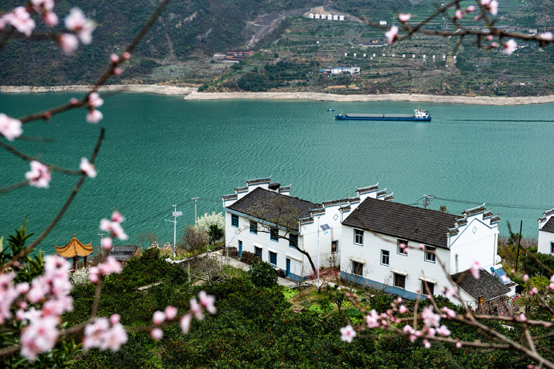 這是2021年2月27日在三峽庫(kù)區(qū)秭歸縣屈原鎮(zhèn)西陵峽村拍攝的鮮花盛開的臍橙園。湖北省宜昌市秭歸縣在建設(shè)美麗鄉(xiāng)村中,因地制宜,在臍橙園里種植桃樹、李樹等果樹。