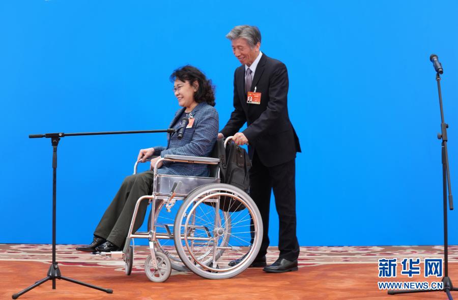 3月4日,全國政協(xié)十三屆四次會議第一場“委員通道”采訪活動在北京人民大會堂新聞發(fā)布廳舉行。這是采訪活動結(jié)束后,全國政協(xié)委員范迪安推著全國政協(xié)委員張海迪離開會場。新華社記者 李賀 攝
