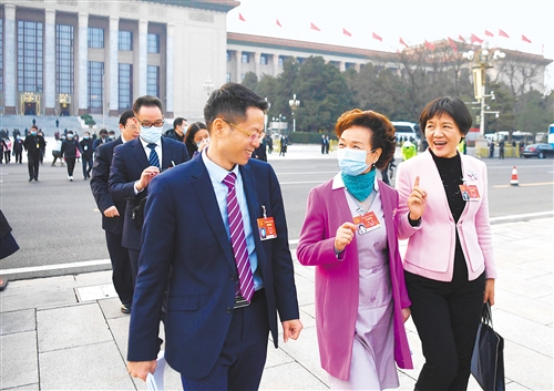 3月8日,十三屆全國人大四次會(huì)議在北京人民大會(huì)堂舉行第二次全體會(huì)議。會(huì)后,人大廣東代表團(tuán)代表陳旭斌(左)、程萍(中)、郭姣(右)就宏觀政策保持穩(wěn)定等話題繼續(xù)交流。經(jīng)濟(jì)日?qǐng)?bào)-中國經(jīng)濟(jì)網(wǎng)記者 李景錄攝