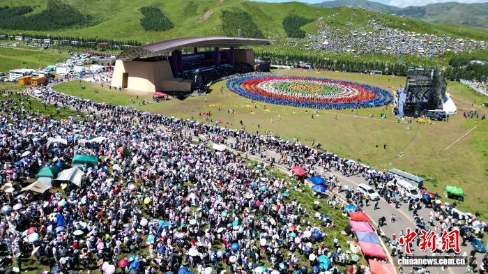 2024年8月4日,第22屆九色甘南香巴拉旅游藝術(shù)節(jié)在甘肅省甘南藏族自治州當(dāng)周草原開(kāi)幕。圖為開(kāi)幕式現(xiàn)場(chǎng)鍋莊舞表演。(資料圖)九美旦增 攝