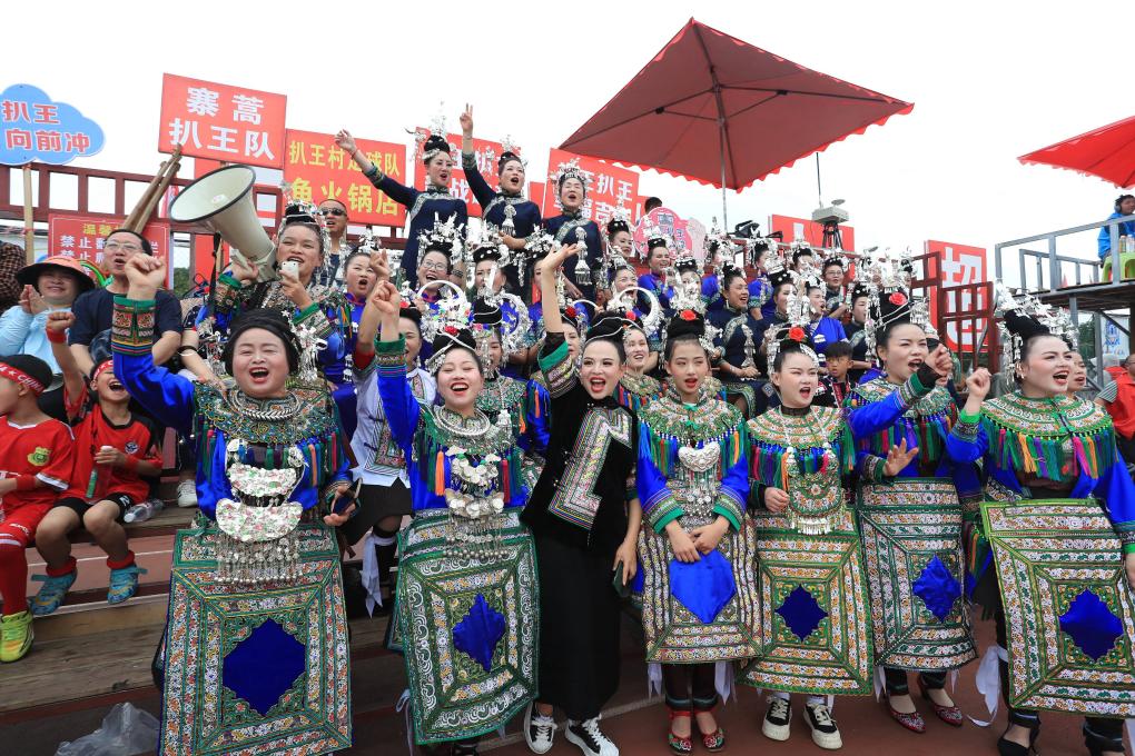 2024年5月4日,在貴州省黔東南苗族侗族自治州榕江縣“村超”球場,當(dāng)?shù)厝罕娚碇⒀b為本村球隊加油鼓勁。新華社發(fā)(楊成利 攝)