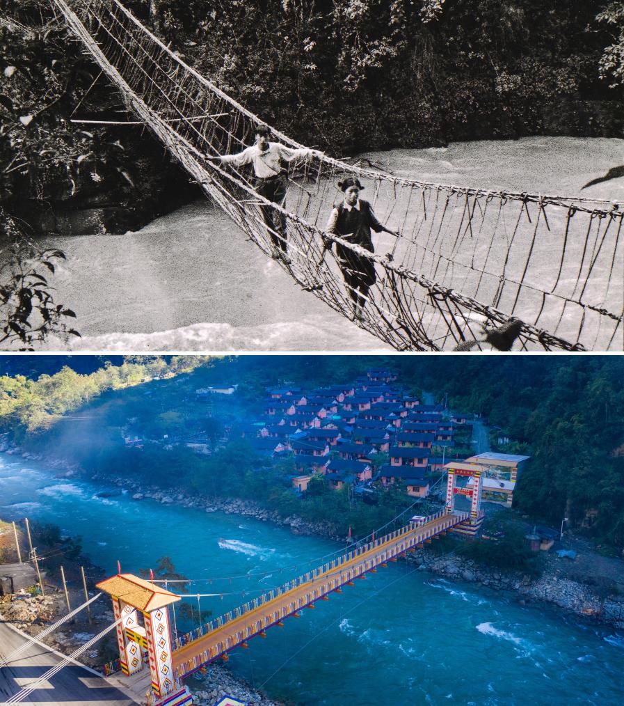 拼版照片:上圖為獨龍族群眾通過藤蔑橋(資料照片);下圖為獨龍江鄉(xiāng)白來感恩大橋(2020年10月29日攝,無人機(jī)照片,新華社記者胡超攝)。獨龍族是我國28個人口較少的民族之一,也是新中國成立初期從原始社會直接過渡到社會主義社會的少數(shù)民族,主要聚居在云南貢山獨龍族怒族自治縣獨龍江鄉(xiāng)。近年來,國家有關(guān)部門和云南省以整體推進(jìn)的思路對獨龍江鄉(xiāng)進(jìn)行集中幫扶,加速消除基礎(chǔ)設(shè)施、產(chǎn)業(yè)發(fā)展、人才素質(zhì)等“瓶頸”問題,使當(dāng)?shù)亟?jīng)濟(jì)社會實現(xiàn)跨越式發(fā)展。2018年,獨龍族整族脫貧,實現(xiàn)“千年跨越”。