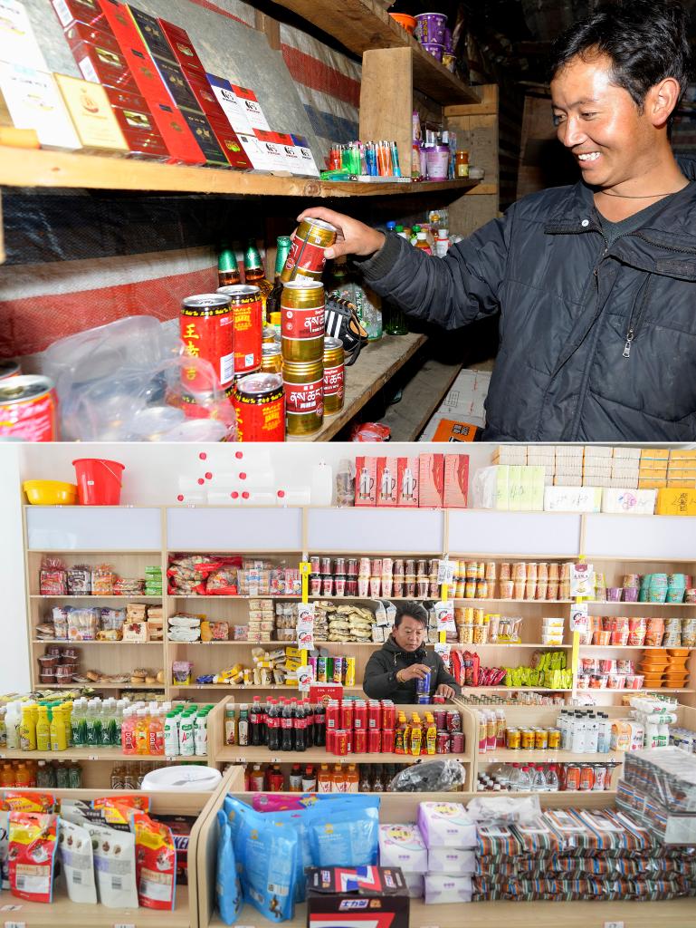 拼版照片:上圖為玉麥鄉(xiāng)一家商店的店主次旦扎西在擺放商品(新華社記者普布扎西攝,2009年9月9日攝);下圖為玉麥鄉(xiāng)一家超市的工作人員白瑪旺堆在店內(nèi)整理商品(新華社記者丁汀攝,2024年10月15日攝)。西藏自治區(qū)山南市隆子縣玉麥鄉(xiāng)地處喜馬拉雅山脈南麓。受惡劣自然條件影響,這里一度只有桑杰曲巴和女兒卓嘎、央宗三人居住,牢牢守在祖國邊境線上,這里也曾被稱為“三人鄉(xiāng)”。如今,曾經(jīng)的“三人鄉(xiāng)”已經(jīng)發(fā)展到67戶200多人,變成下轄兩個行政村的“小康鄉(xiāng)”。學(xué)校、衛(wèi)生院、游客接待中心等建筑物在這里拔地而起,不少村民用自家房屋開起了家庭旅館、小賣部、快遞站等……2023年,玉麥全鄉(xiāng)人均年收入超4萬元,人均居住面積達(dá)40平方米。如今的玉麥,迎來了“蝶變”。
