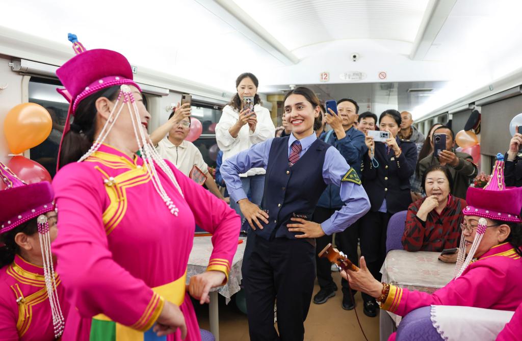 在由喀什開往成都西的列車上,塔吉克族列車長艾爾開牙·多力開與民間藝人一起跳舞(2024年4月19日攝)?;貞浫肼毥?jīng)歷,艾爾開牙·多力開說:“這是一次幸福的機(jī)遇?!?019年,為助力脫貧攻堅,鐵路部門在新疆喀什、和田等地招錄1000多名應(yīng)屆畢業(yè)生。剛走出大學(xué)校門的艾爾開牙·多力開抱著試一試的心態(tài),帶著對遠(yuǎn)方的憧憬,與鐵路結(jié)緣。在擔(dān)任列車員的四年時間里,艾爾開牙·多力開一步步成長,工作出勤、作業(yè)規(guī)范等考核都名列前茅。2023年下半年,她以優(yōu)異成績通過系列綜合測評,成為我國首位塔吉克族列車長。新華社記者 胡虎虎 攝