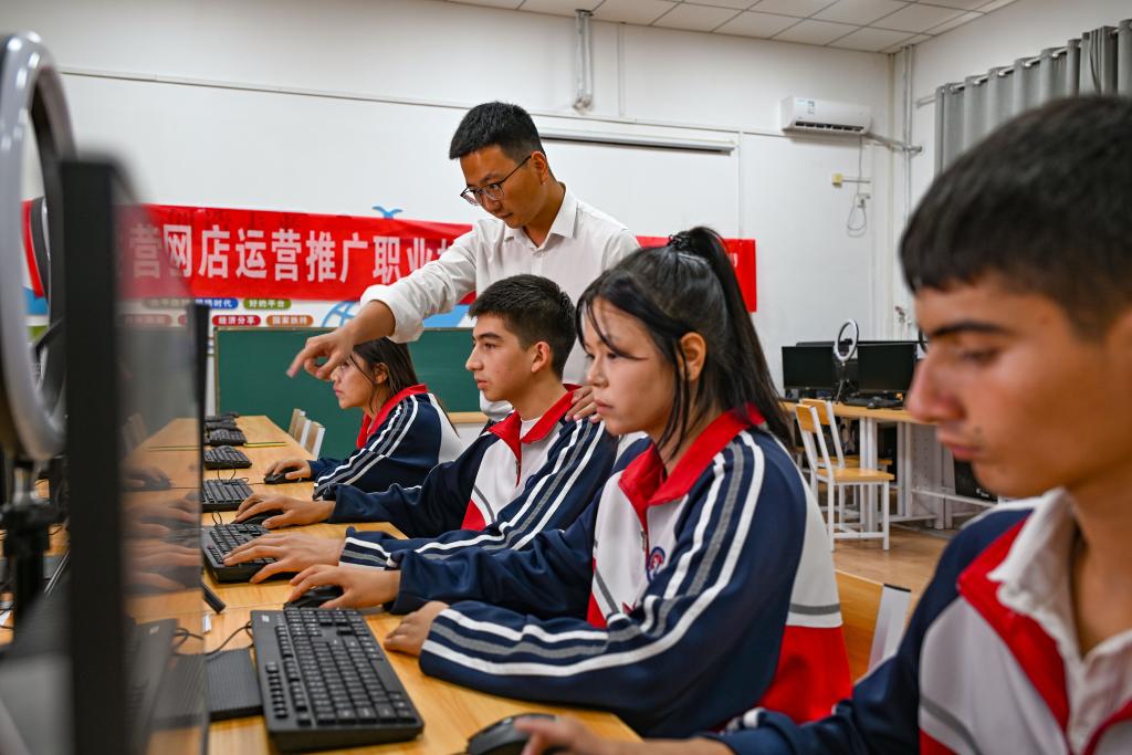 2024年9月10日,在阿拉爾職業(yè)技術(shù)學(xué)校,李斌傲在實訓(xùn)室指導(dǎo)學(xué)生?!?5后”年輕教師李斌傲是第十一批浙江臺州到新疆阿拉爾職業(yè)技術(shù)學(xué)校援疆教師中的一員。2023年2月,李斌傲前往阿拉爾任教。一年半任期結(jié)束后,他沒有選擇回到臺州,而是申請留下來,在阿拉爾繼續(xù)播撒知識的種子。新華社記者 陳朔 攝