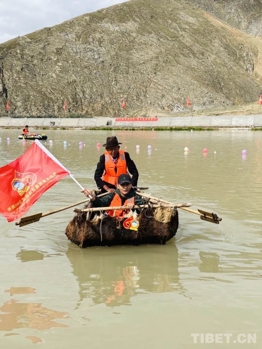 圖為南木林縣慶祝西藏自治區(qū)成立60周年文藝匯演中劃牛皮船項(xiàng)目
