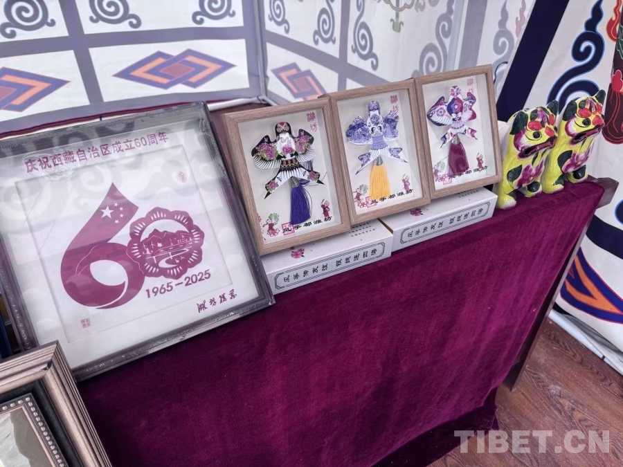 圖為南木林縣慶祝西藏自治區(qū)成立60周年文藝匯演現(xiàn)場(chǎng)所展示的剪紙和濰坊風(fēng)箏