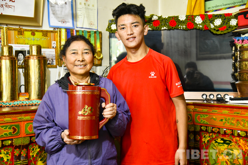 圖為羅布次仁為母親卓嘎倒上第一杯酥油茶,這對(duì)茶杯是西藏自治區(qū)成立50周年中央代表團(tuán)贈(zèng)送的禮物 攝影:趙振宇
