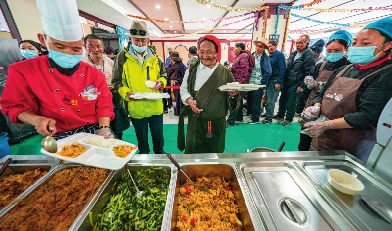 在西藏那曲市色尼區(qū)老年人日間照料中心,老人們在排隊打飯(2025年4月25日攝)丁增尼達(dá)攝/本刊